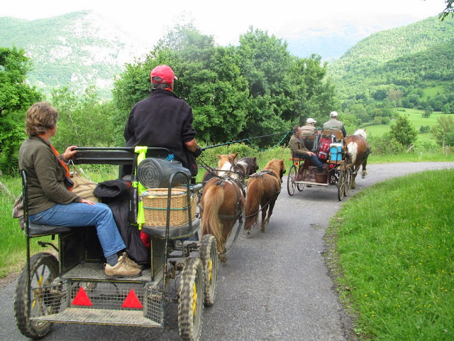 Nous attendons les attelages qui ont, eux aussi, géré la grimpette avec brio, merci aux chevaux, et repartons dans une descente somptueuse vers la vallée. Superbe paysage que viennent égayer quelques rayons de soleil.